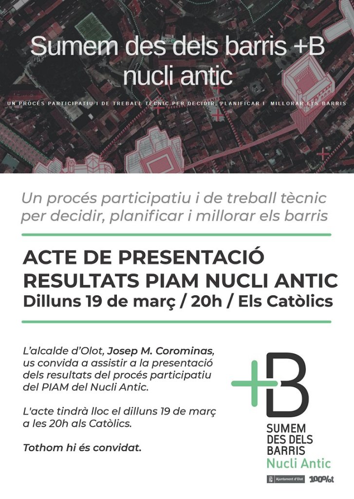 Amb la presència de l’alcalde d’Olot, Josep M. Corominas, es presentaran els resultats d’aquest projecte participatiu i de treball tècnic per decidir i planificar com actuar al barri més antic de la ciutat. Amb això, arrencarà la fase en la qual es realitzaran accions concretes de millora urbana i que afermaran els mecanismes que assegurin el correcte desenvolupament del Pla.